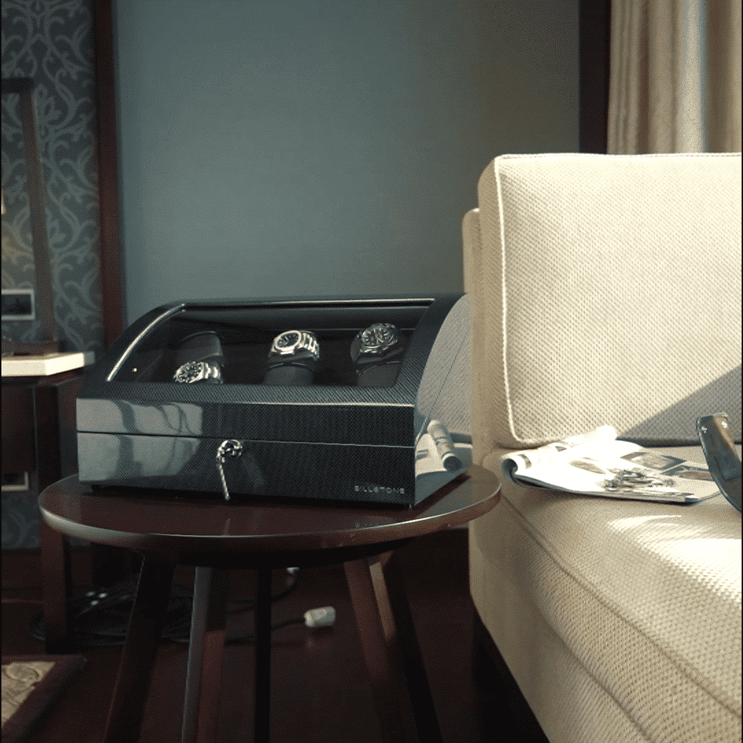 تم تشطيب صندوق لفاف الساعة بنمط ألياف الكربون و10 طبقات من البوليستر عالي اللمعان. الجزء الداخلي من ملفاف الساعة مبطن بالمخمل الأسود لحماية ساعاتك من الخدوش.