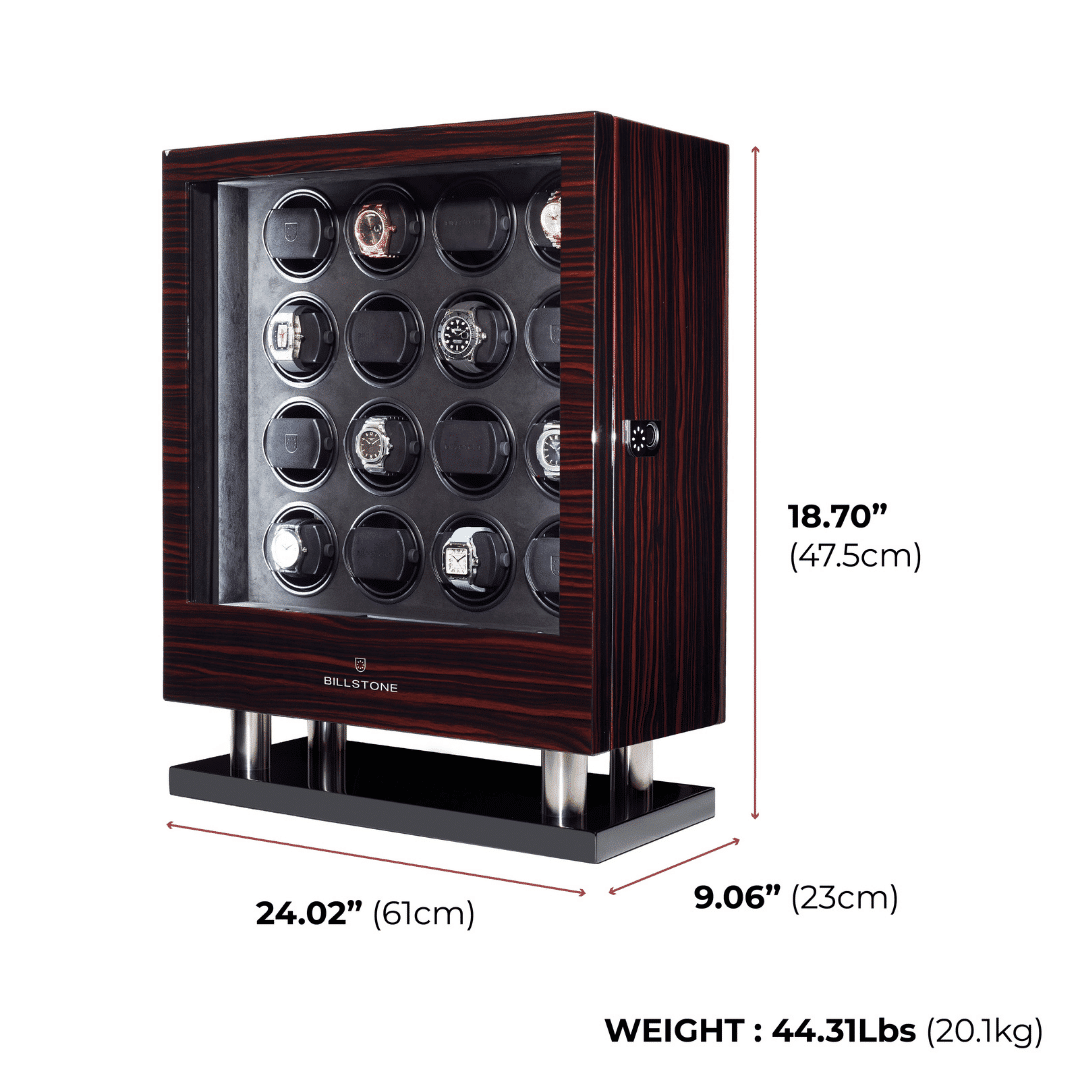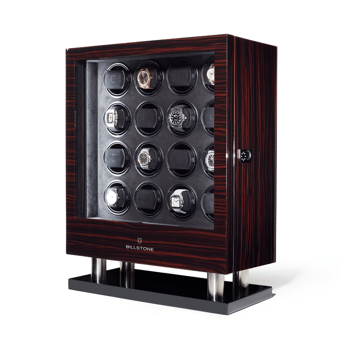 Bobinadora de relojes Billstone serie Enigma El enrollador de relojes Enigma es una de las líneas de productos más populares de Billstone. Está construido con materiales lujosos y de alta calidad: patas de acero inoxidable, acabado en madera exótica, revestimiento interior lujoso y suave y un sistema patentado de sujeción de relojes que sujeta de forma segura sus relojes automáticos. El enrollador de relojes Enigma es un artículo imprescindible para todo coleccionista de relojes serio.