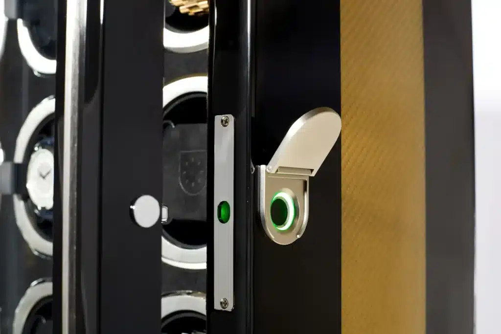 A modern fingerprint lock with protective lid combined with a mechanical security knob system. The top door cannot be opened unless the front door is unlocked — providing controlled, layered access to your collection.