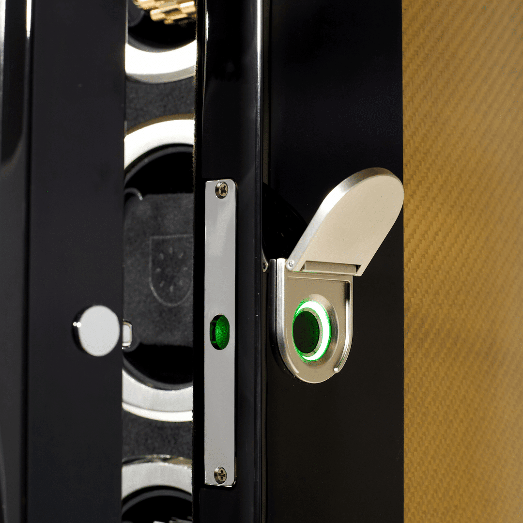 Menggunakan kunci sidik jari modern yang dilindungi penutup khusus agar sensor tetap bersih, awet, dan akurat. Dipadukan dengan security knob system yang mencegah pintu atas terbuka sebelum pintu depan dibuka, memberikan perlindungan ganda untuk koleksi jam Anda.