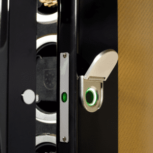 The front door is secured with a fingerprint lock protected by a dedicated lid, ensuring the sensor remains clean, durable, and accurate over time. This biometric access works in tandem with a mechanical security knob system: the top door cannot be opened unless the front door is unlocked first.