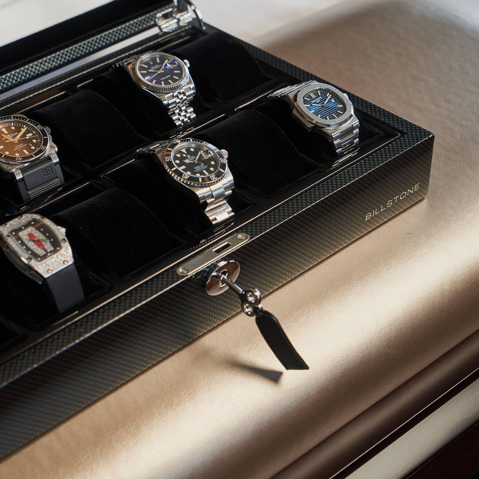 時計ボックスは木製のベースで作られ、カーボンファイバープリント紙で裏打ちされ、その上に高光沢のポリッシュラッカーが塗布されています。