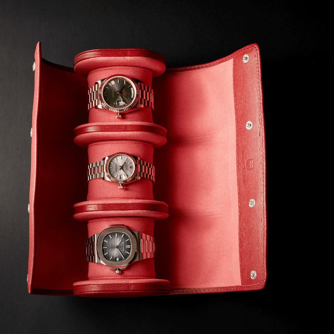 ウォッチロールを開けるには、留め具を外します。時計を所定の位置にしっかりと固定し、しっかりと収まるようにしてください。留め具を慎重に元に戻してください。旅行中は、時計が正しい位置に収まっていることを定期的に確認し、安全で保護された状態を保ち、美しく保管してください。
