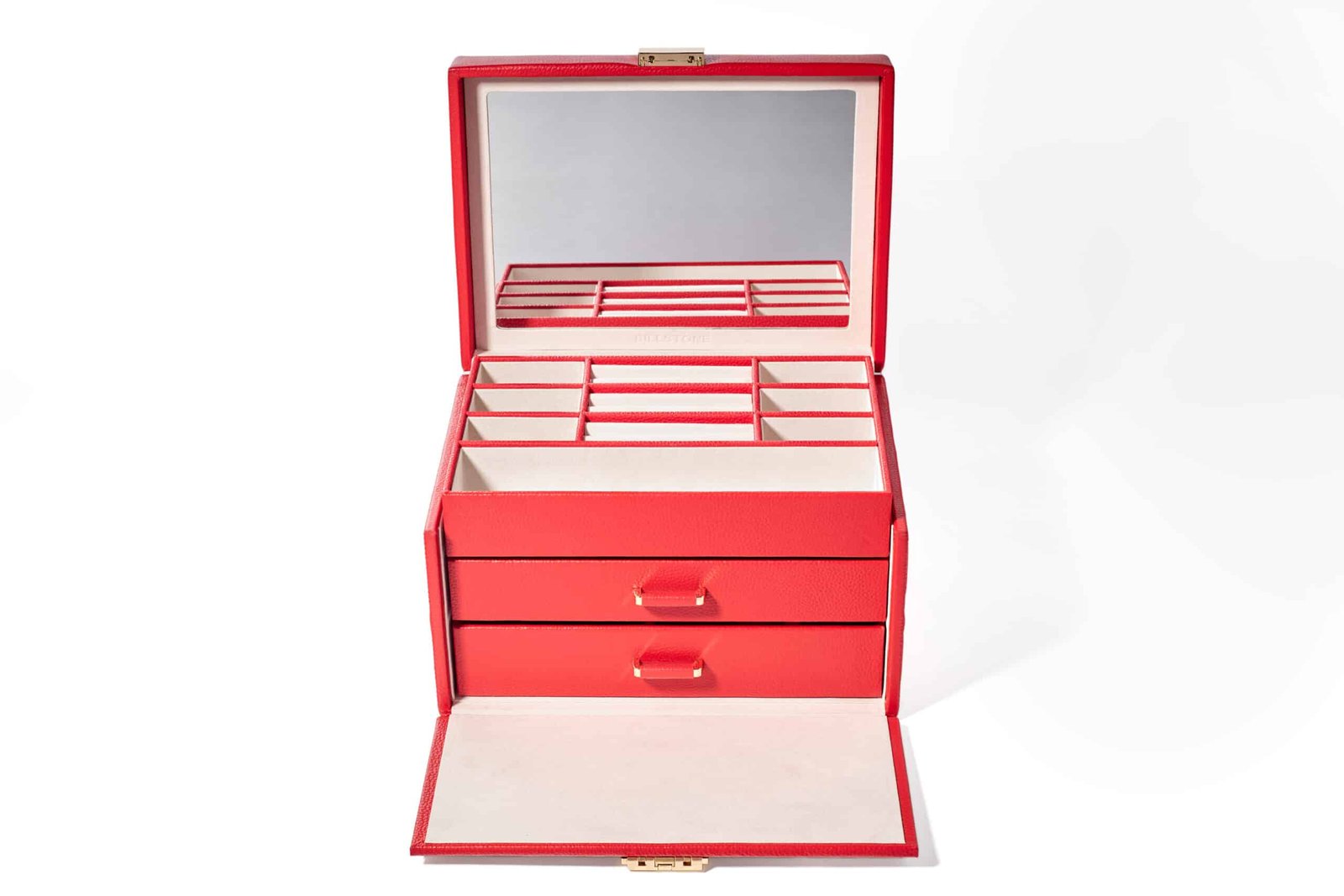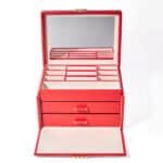 Tray 3: Features 3 sections for various jewelry items, along with a small box containing 5 ring slots and 1 compartment with a mirror for easy viewing.