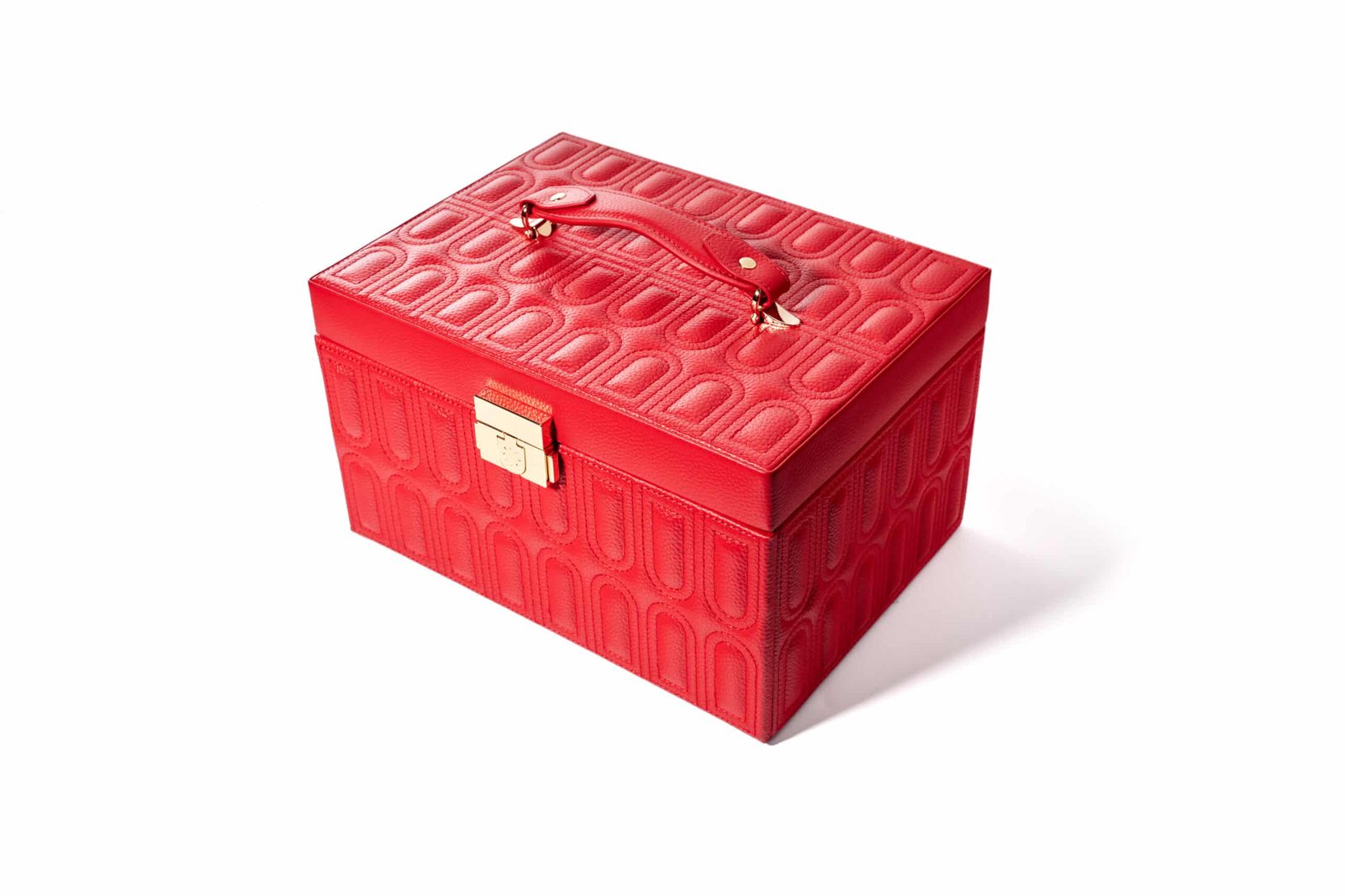The exterior is adorned with Signature Red genuine leather. Inside, an ivory suede finish provides a plush and protective environment for your valuables.