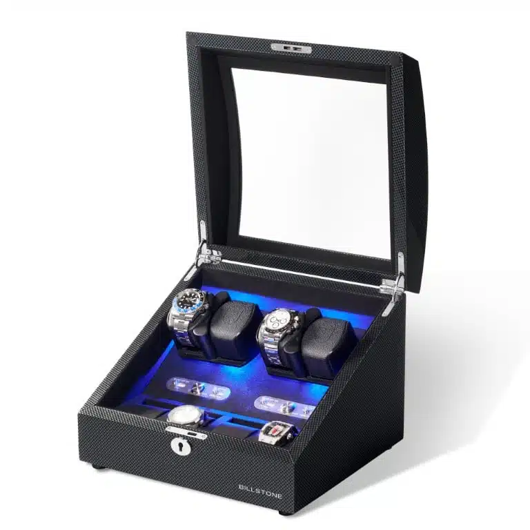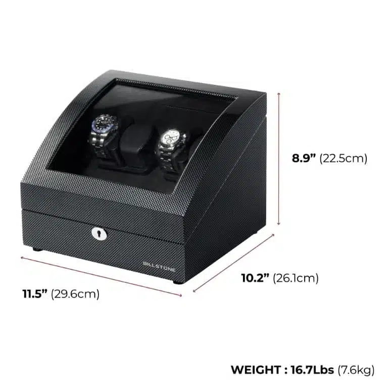 The watch winder’s box is finished with Carbon Fiber Pattern and High Gloss Polyester 10 layers.