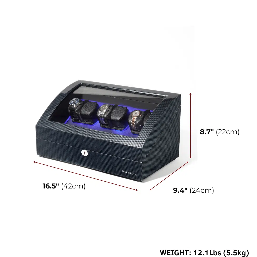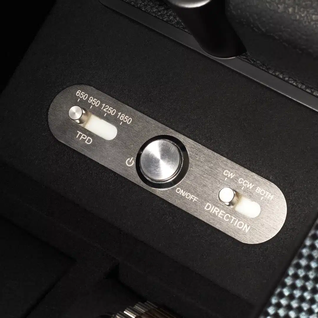 The watch winder’s box is finished with Carbon Fiber Pattern and High Gloss Polyester 10 layers.