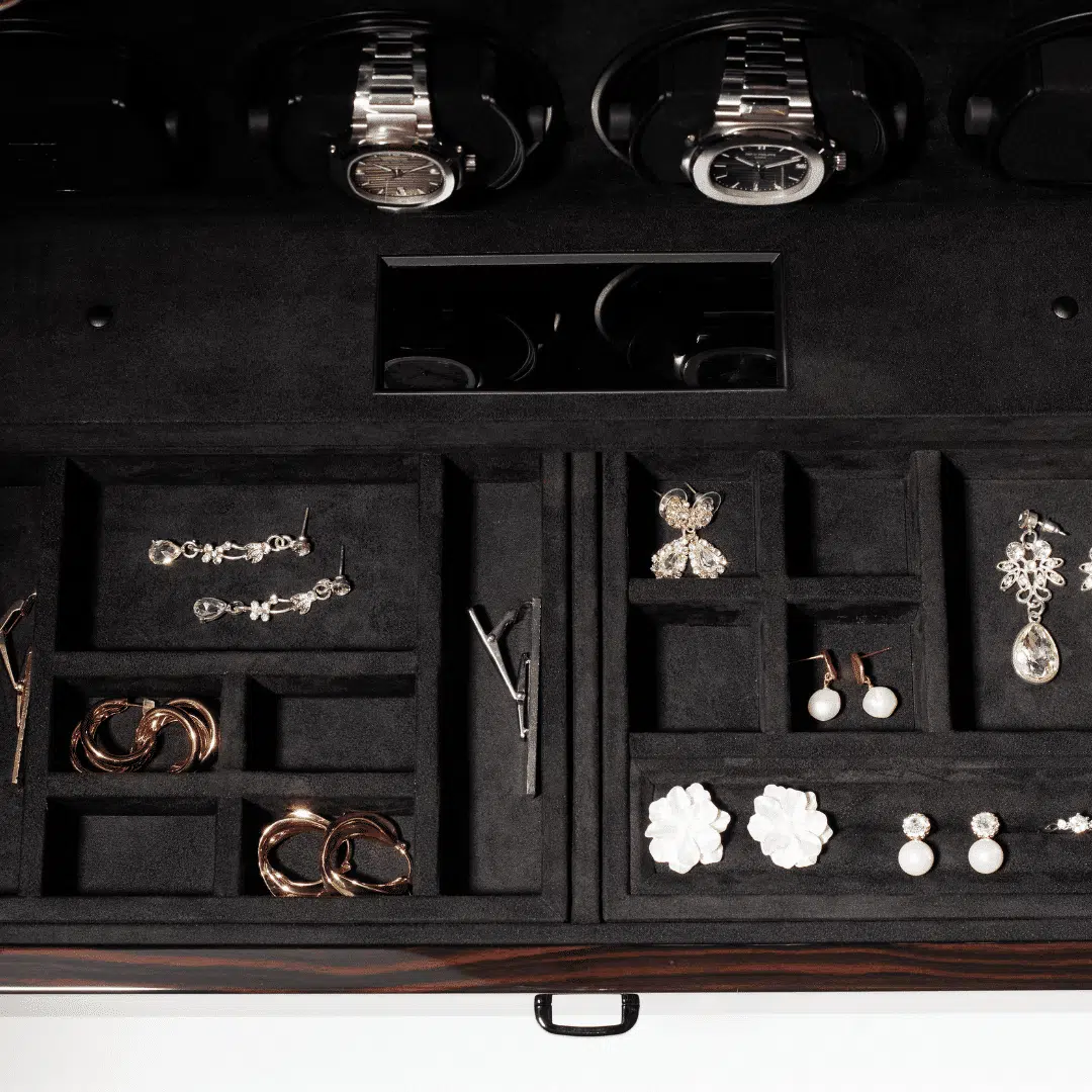 Built-in jewelry compartment to safely store rings, bracelets, and other small accessories alongside your watches